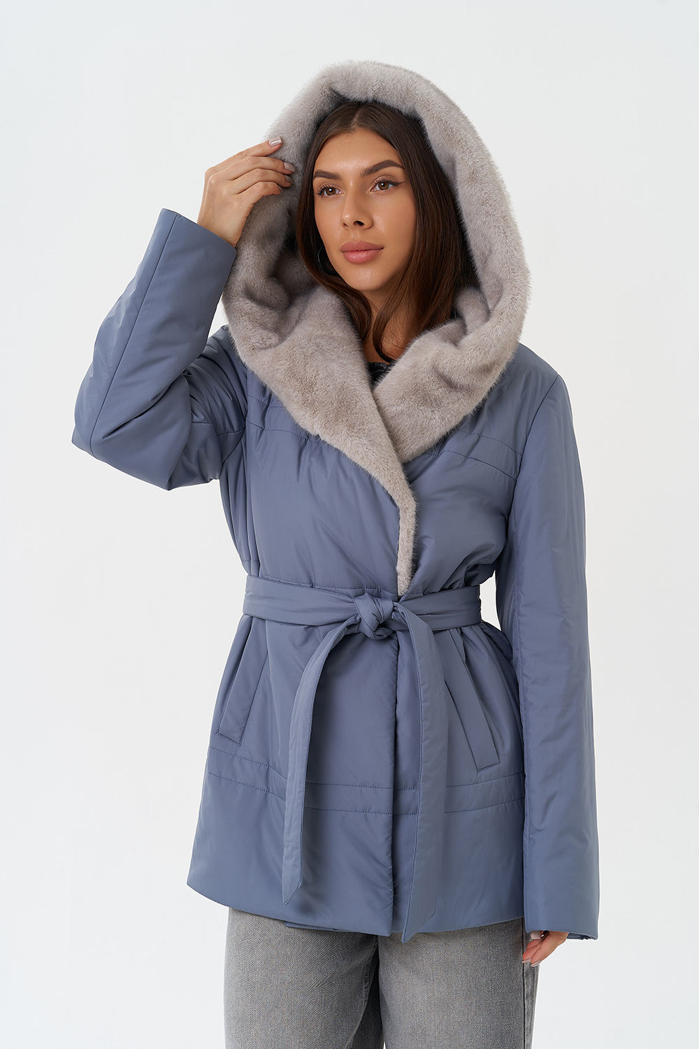 Крой воротника - капюшон, отделка эко мех под норку